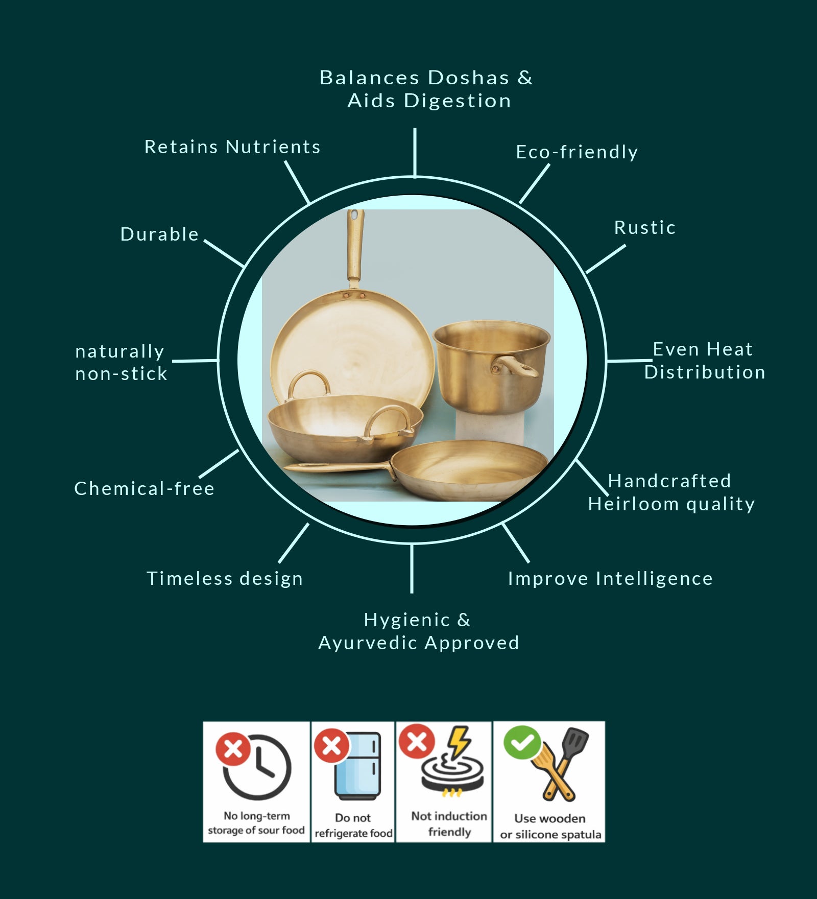 Bronze cookware offers Ayurvedic benefits due to its non-reactive nature and even heat distribution. It helps balance the body's dosha and retains over 98% of the food's nutrition, making the dishes flavorful and nutritionally rich. Cooking in bronze cookware promotes health consciousness, avoiding potential risks associated with using copper or brass with acidic foods. Its unique aroma enhances the culinary experience, making cooking a mindful and enjoyable process aligned with Ayurvedic principles.
