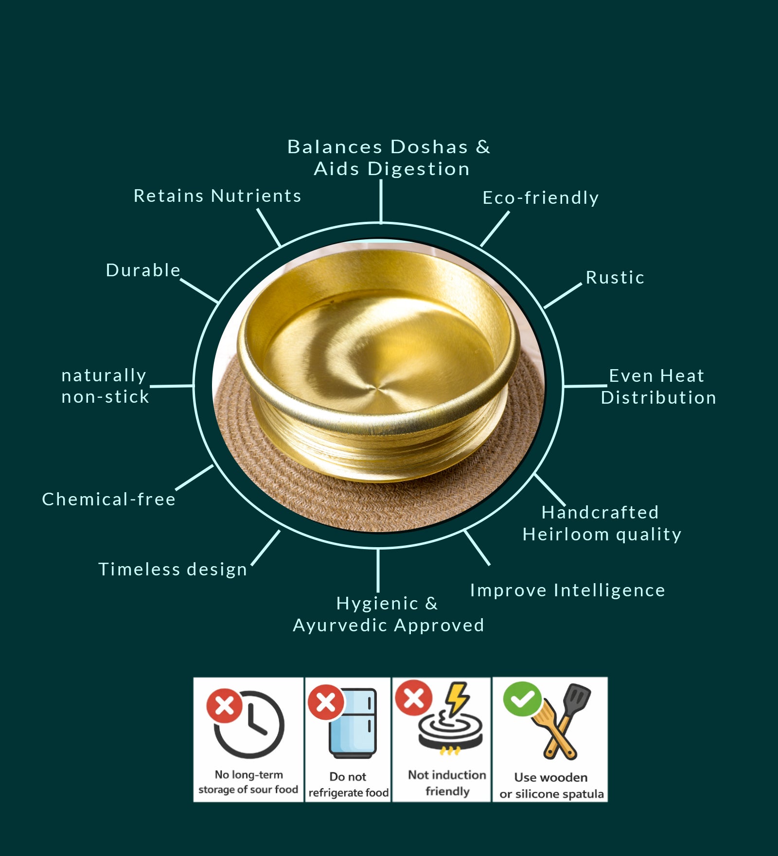The Uruli is a versatile cookware that allows you to prepare a wide range of dishes, including vegetables, various types of meats, Biriyani, pickles, and sweets like payasam and halwa. Its appreciable thickness prevents food from sticking to the bottom, and it retains heat for a longer duration while requiring less oil. With proper care and usage, bronze Uruli cookware can last for many years, making it a durable alternative to non-stick or steel cookware, which may need replacement every few years.