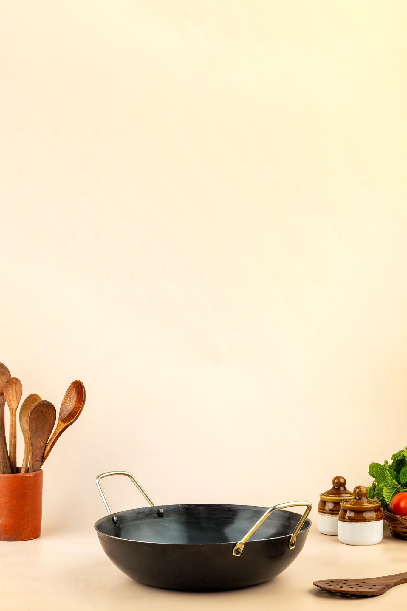 Introducing the 80's Cookware Pure Iron Flat Bottom Kadai with a flat bottom, thoughtfully designed for ultimate convenience. This versatile kadai is your ideal kitchen companion, compatible with various stoves, including induction stoves, making it a versatile addition to your cookware collection.