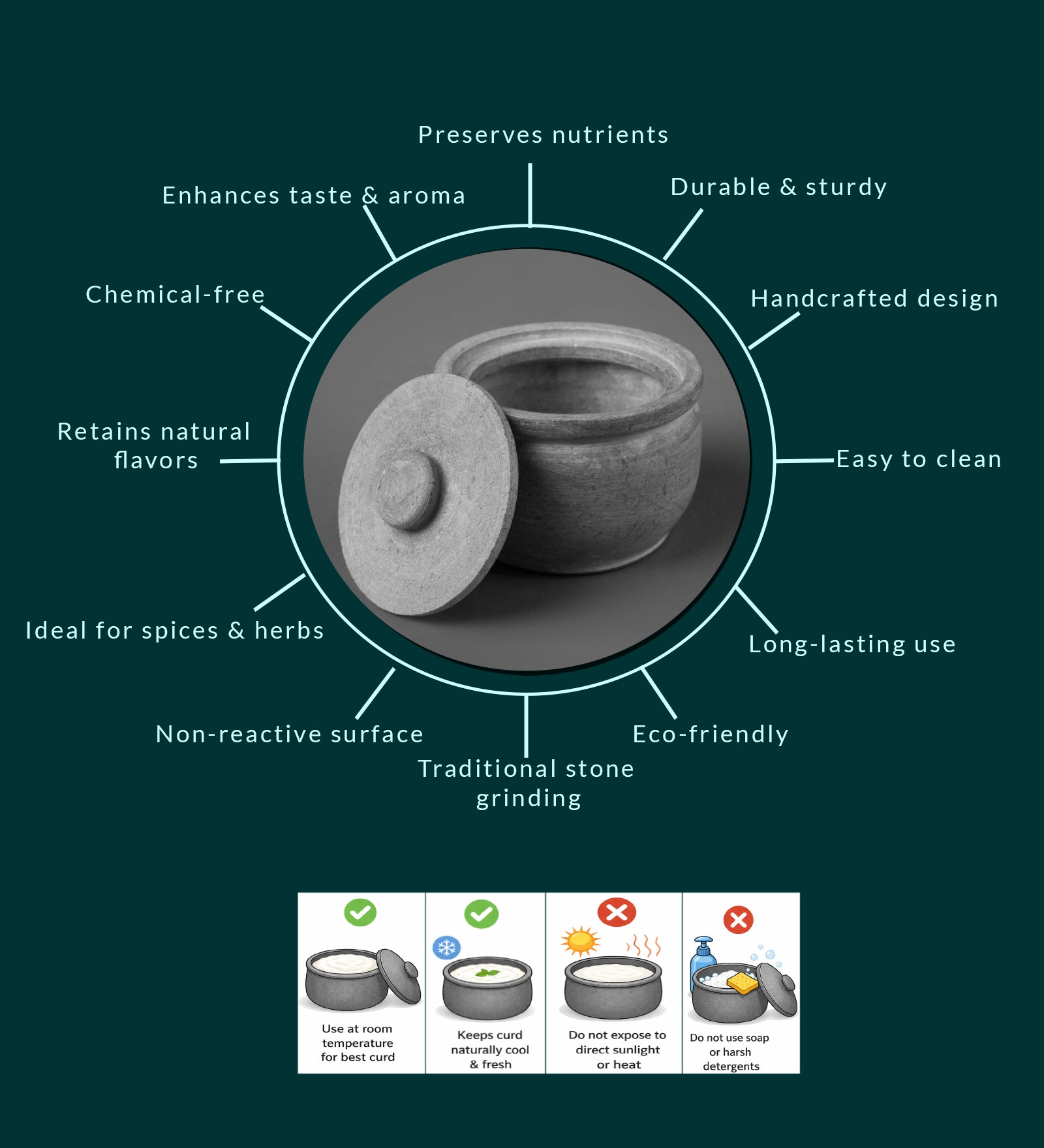 Soapstone, known for retaining heat for extended periods, behaves much like a casserole, keeping your food warm and ready to serve. These traditional maakal containers, a true culinary gem, are especially celebrated for effortlessly producing the tastiest and thickest curd, with the advantage of soapstone's heat-retaining properties, ensuring curd sets within 4-5 hours.